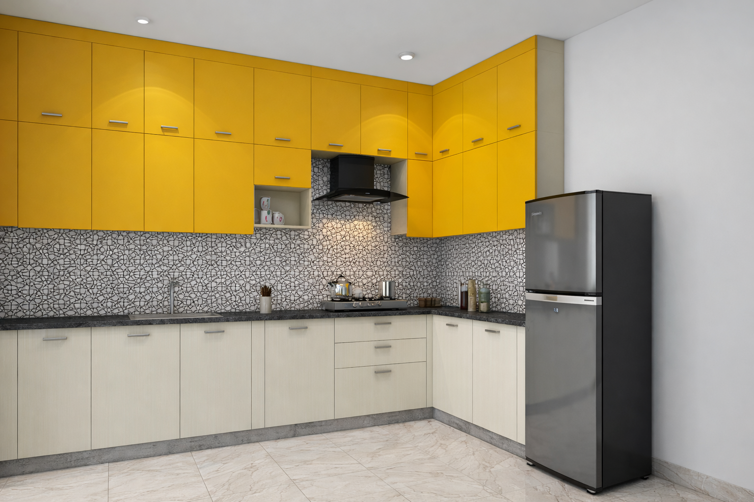 Transform your cooking space with our Modern Modular Kitchen Cabinet Design with Dual-Tone Finish, crafted to deliver both functionality and modern aesthetics. This kitchen cabinet design features a vibrant yellow upper cabinet system combined with light wood-finish lower cabinets, creating a bold yet balanced interior look.