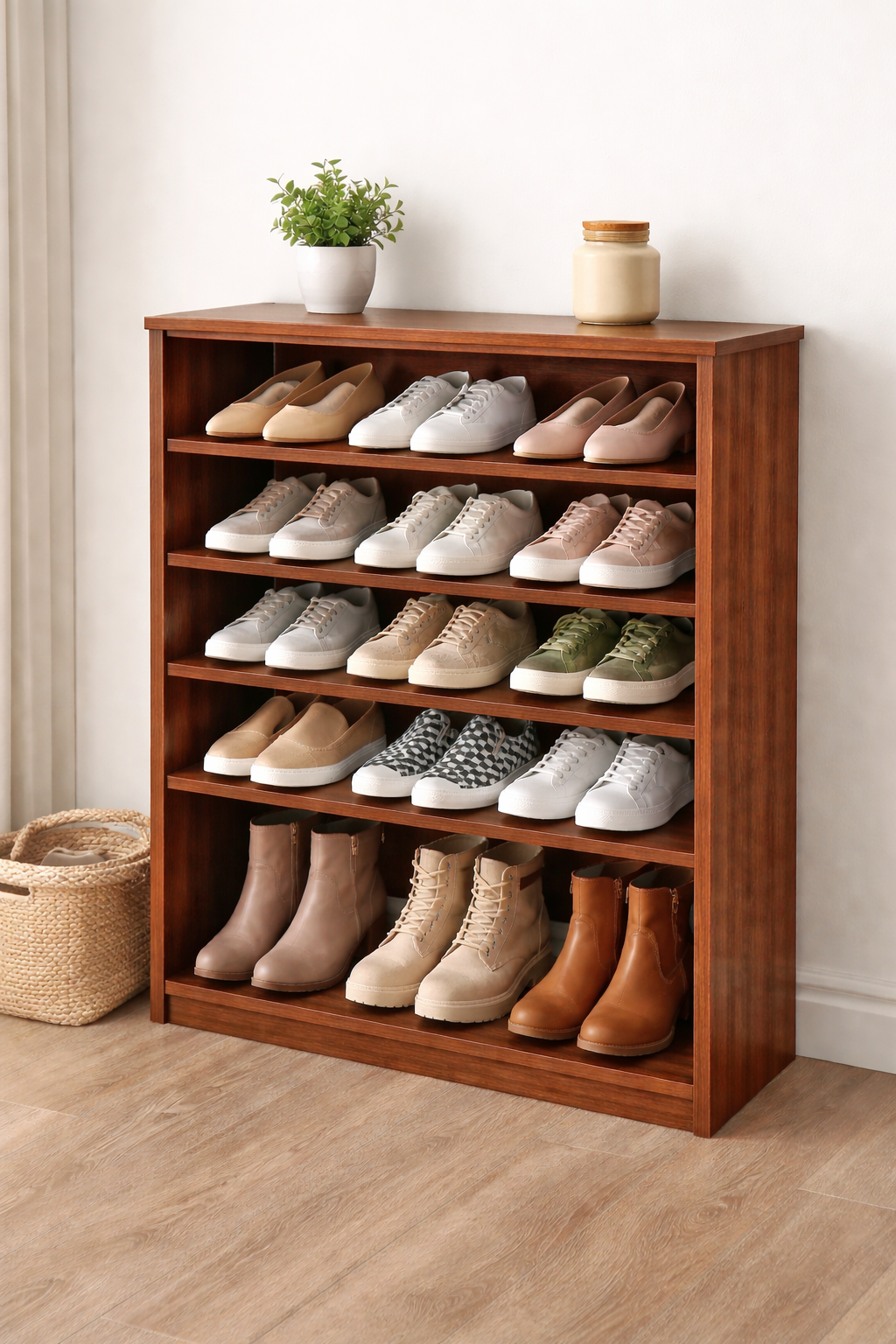 Keep your home neat and organized with this stylish wooden shoe rack. Designed with multiple storage shelves, it provides ample space to store sneakers, sandals, and boots while adding a modern touch to your entryway or bedroom.